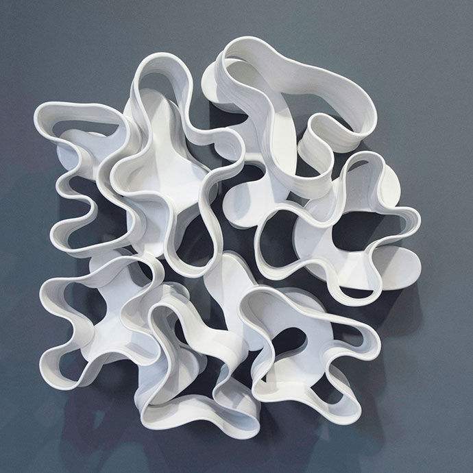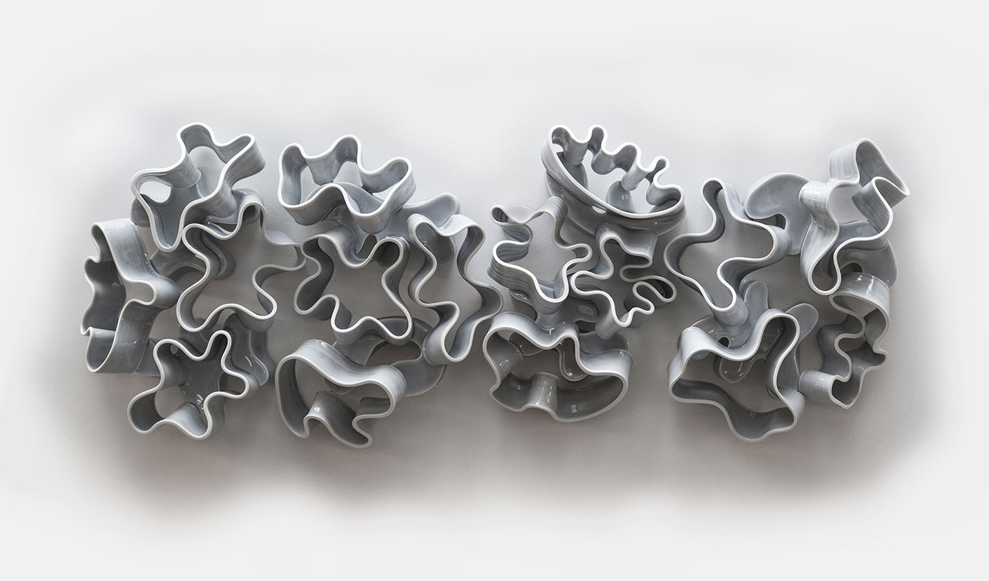 Of the different clays porcelain is perhaps the best suited to suggest movement and flow. Its smooth surface and softness to the touch make it a pleasure to handle and to throw on the wheel. Later during firing, it turns into one of the hardest and most durable ceramic materials. The works are assembled from individual elements that are thrown on the wheel and altered. Open forms are placed on closed shapes in such a way that they move and distort during the firing, thereby integrating the two layers into a dynamic whole. Except for the all white pieces, each sculpture is glazed in order to create a contrast with the unglazed, matt white edges of the porcelain.